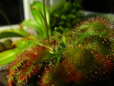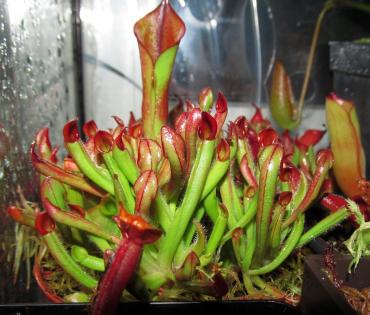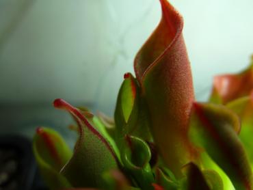 Cefalotus rósł w doniczce 5,5cm i chciałem mu polepszyć , poza tym szukając informacji o hodowli przeczytałem w którymś z opisów, że najlepiej przesadzać na jesieni, zimą lub wczesną wiosną więc niestety przesadziłem. Biały nalot na liściu to osad z Topsinu, którym spryskuję cefalka profilaktycznie co dwa tygodnie. Dziś poziom wody obniżyłem do 1,5cm(przy 4cm powierzchnia podłoża była lekko wilgotna-jak to gdzieś przeczytałem-"jak wyciśnięta szmata"). Ogólnie trochę się obawiam tak niskiego poziomu wody czy nie przesuszę rośliny, pracuję 10godz. i gdyby coś się działo nie będe mógł zareagować na czas, a słonko grzeje już dość mocno tym bardziej przez szybę. Na zewnętrzny parapet na obecną chwilę też nie mogę go wystawić, druga sprawa to, że dość liczna populacja kawek szybko by się rozprawiła z cefalem .