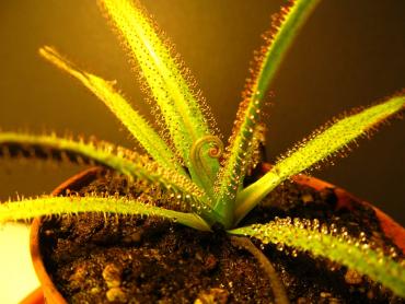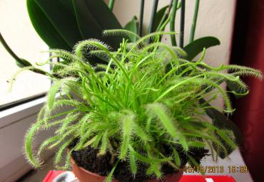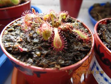 16. Witam.Posiadam rosiczkę zakupioną w Carnisana.pl o nazwie drosera sp. Botswana.Co to jest za mieszaniec?Traktuję ją jak inne rosiczki tropikalne ale mimo to bardzo słabo rośnie,większość liści które miała uschło a nowe są małe. Podlewam destylką i doświetlam na południowym parapecie. Zdjęcia zaraz po zakupie i z dzisiaj.Proszę o pomoc.