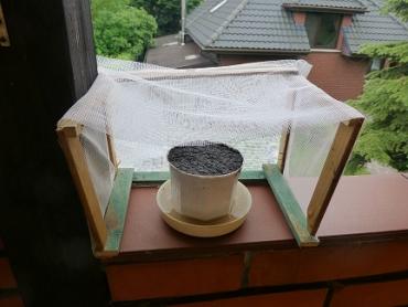 16. No to się bardzo cieszę, pewnie gorzej będzie późną jesienią i zimą, bo wtedy bezpośredniego słońca będzie naprawdę symbolicznie, ale to będę się martwił i najwyżej doświetlał wtedy. A tak w ogóle to postanowiłem zrobić eksperyment mały i wysiałem nową doniczkę która będzie ustawiona cały czas na dworze, pod osłonką z firanki i porównam sobie rozwój. Stare listewki i firanka, młotek gwoździe, zszywacz i zrobione