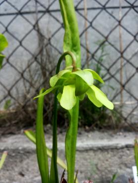 Oto kwiaty, tak wyczekiwane w celu identyfikacji rośliny: Dodam, że miejsce i warunki chyba są idealne, bo rośnie toto jak szalone. Zobaczymy, czy nie będzie trzeba nieco ograniczyć tej sielanki... Drugi, oczekiwany ze zdecydowanie większą niecierpliwością i obawami kwiat: Sarracenia minor W tym wypadku kwiatów się nie spodziewam (bo jak wspomniałem na wstępie tematu, zakładam, że to jakaś paproć), ale bardzo się cieszę, że udało się przeżyć przesadzanie i warunki okazały się sprzyjające.