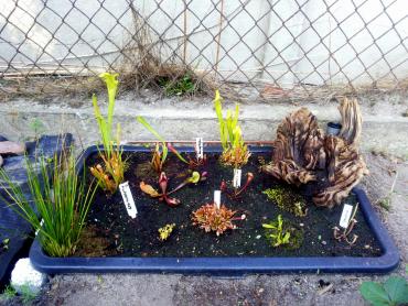 Warszawska wystawa pozwoliła dokonać dzieła i obecnie wygląda ono tak: Zawiera: Sarracenia chelsonii Sarracenia purpurea Sarracenia leucophylla Sarracenia x catesbaei Sarracenia psittacina Sarracenia 'Juthatip Soper' Sarracenia 'Smoorie' Sarracenia flava Sarracenia minor Dionaea muscipula Dionaea muscipula 'Red-Green' Utricularia cornuta Utricularia prehensilis Utricularia livida Utricularia sandersonii Utricularia calycyfida Drosera capensis Drosera filiformis Drosera biniata Pinguicula 'Tina' Pinguicula lusitanica Cephalotus follicularis Sphagnum fimbriatum Juncus effusus i coś paprociopodobnego z minorowej doniczki. Zdając sobie sprawę, że to nie będzie raj dla większości pływaczy, postanowiłem sprawdzić, czy któryś choćby ledwo przeżyje. Taki U. sandersonii nic sobie nie zrobił ze zmiany warunków i zaniesiony z pędem kwiatowy, zakwitł, ale reszta marnie zniosła przeprowadzkę. Liczę na U. cornuta!