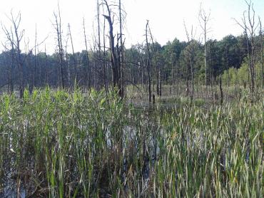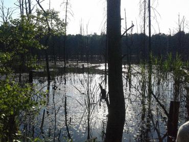 Ostatni raz byliśmy w tym miejscu pod koniec zimy. Wówczas nie spodziewaliśmy się zastać tego - po co przyszliśmy. Dotarcie do "martwego jeziorka" zajęło nam wtedy kilka godzin, choć to tylko parę kilometrów od domu. Wiatr wił się jak wąż między bezlistnymi drzewami, zimny i głośny. Na tafli jeziorka skutego lodem ślady upadku i gramolenia się jakieś sarny, która pewnikiem w iście kabaretowy sposób musiała wywinąć tam orła. Z bezkształtnie poukładanych belek oraz pni drzew postawiono prowizoryczne molo, które swoim wyglądem wzbudziłoby strach i mocne kołatanie serca u największych twardzieli. Właśnie tam był nasz punkt obserwacyjny. Lód był tak gruby, że bez problemu utrzymałby ciężar człowieka, jednak nieprzebrana i niezbadana czerń wszystkich tajemnic które lód pod sobą ukrywał, utwierdzał w przekonaniu że nie warto ryzykować. Co kilka metrów wyrastały pnie obumarłych i już całkowicie spróchniałych drzew. Nasiąkały całe lata czernią wody, stając się latarniami świecącymi na czarno wśród bieli Lodu. Gdzieniegdzie nieśmiało przebijał się przez śniegi mech torfowiec, utwierdzając nas w przekonaniu że trafiliśmy nie gdzie indziej jak na torfowisko "martwe jeziorko". To chyba był jakiś wielki mistyczny plan, dzięki któremu lub przez który dziś trafiliśmy tu ponownie. Nic się nie zmieniło. Mimo iż zeszły śniegi i stopiły się lody, jezioro dalej stało niewzruszone, dalej martwe i dalej przerażające. Wiatr ustąpił miejsca godowym rechotom żab, a szum trawy abstrakcyjnie koił uszy podczas gdy wzrok kalał się tym smutnym widokiem. Ta kraina już dawno zapomniała o śniegu odsłaniając zieleniutki mech torfowiec w pokaźnych ilościach. Zaczęliśmy poszukiwania.. Najpierw skromnie odsłaniając ręką wysokie trawy porastające przybrzeżne siedliska mchów, później gorączkowo, zważywszy na zbliżający się wielkimi krokami zachód słońca. Przecież żadne z nas nie było gotowe by móc tam spać, a przede wszystkim, żadne nie chciało. Po kilkudziesięciu minutach i na kilku stanowiskach, niestety nie udało się nam ujrzeć tego, po co przyszliśmy - jednej z kilku rodzajów rosiczek. Jednak udało się zaobserwować i dokładnie sfotografować jedną szczególną roślinę owadożerną "pływacza zwyczajnego" (U. vulgaris). Na wpół szczęśliwi mogliśmy powrócić do domu z uśmiechem na ustach i nutką żalu w sercu. Ale jeszcze tu wrócimy i znajdziemy je !! Torfowisko: U. vulgaris: Oraz jedni z wielu dziwnych stworzeń z tego jeziorka: Czarna jak smoła żabka: i jak węgiel czarna pijawka: