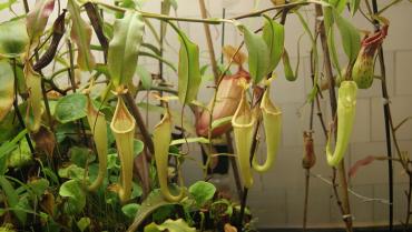 Cephalotus: Głęboka piwnica w starym domu. Dawniej było tylko stuczne światło, teraz w południowej ścianie pojawiły się dwa duże okna poniżej poziomu gruntu, we wnękach, więc światło dzienne dociera. -