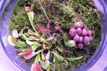 Dla przełamania nudy moje owadożery nieco inaczej Drosera capensis Drosera rotundifolia Drosera intermedia i tulipan