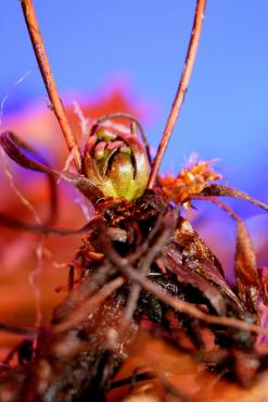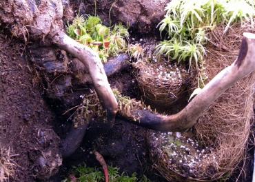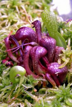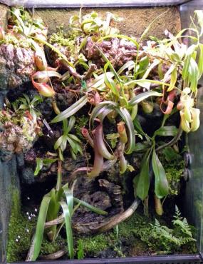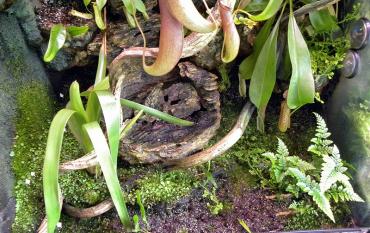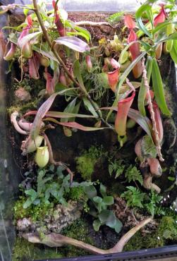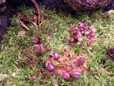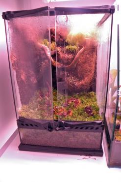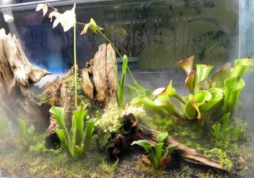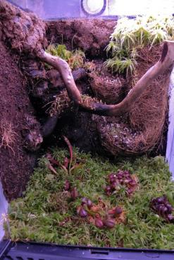 Moje nowe terrarium z gatunkami zimnolubnymi - niewielkie po to aby łatwo można było przenieść do zimowania, 4 darlingtonie, kapturnica, muchołówka i binaty Darlingtonie ruszyły już ładnie po zimowaniu i zaczynają puszczać coraz większe pułapki. Ścianki zrobione jak w innych zbiornikach rozdrobniony kokos przyklejony na silikon, a korzenie i kokosowe maty przyklejone pianką poliuretanową Podłoże stanowi dobrze wypłukany keramzyt i żywe torfowce, które mam nadzieję będą dobrze rosły dzięki zimowaniu