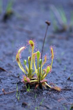 Pora pokazać, że występują tutaj rosiczki Z badań zimowych turiony rosiczek, okrągłolistnej ten delikatniejszy i bardziej zbity długolistnej Sporo jest także ciekawych roślin w samym jeziorze, które należy do grupy jezior lobeliowych (ok. 180 w Polsce) i 7 w których występuje poryblin kolczasty - drobne ciemno zielone szczypiorki, te jasne rozetki to lobelia jeziorna. Wszystkie te gatunki oczywiście podlegają ochronie gatunkowej. Będąca również pod ochroną jeżogłowka pokrewna -