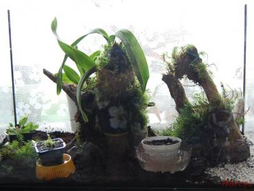 15. Dziś przebywając w lesie na grzybach (których dość mało niestety jest ) Postanowiłem urządzic takie o to cóś Narazie doniczki i podstawki rażą w oczy i brak oświetlenia ale jak wszystko będzie ok to rosliny przesadze do podłoża a świetlówki zamontuje lada moment. W terrarium umieściłem Kapturnice purpurea, muchołówkę "typical" - młode odrosty, siewki D.spatulata pink flower oraz storczyka cymbidium... Aaaa i sorki za jakość zdjęć ale robione na szybko i nie widać wszystkiego dokładnie. Mchu są dwa różne gatunki...