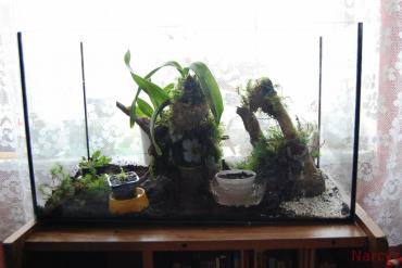 14. Miałem więcej mchu do dyspozycji ale wolałem pozostawić także gołe połacie torfu. Niestety dałem zbyt małą warstwę podłoża. Tylko podstawkę kapturnicy udało się ukryć. Zamontowałem tak dla klimatu oswietlenie aquaela moonight ale nie mam jak swoim starym sprzętem uwiecznić to na focie...