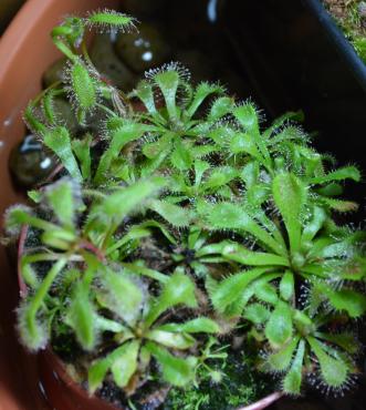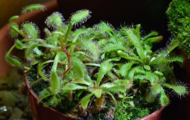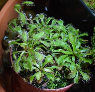 Przesadziłem przed chwilą D. regię. Jednak ją przelałem, w starszej doniczce (mieszanka na dnie była bardzo mokra). Do nowej doniczki dałem na dno grubą warstwę keramzytu. Torf wymieszałem z piaskiem, perlitem. Ponieważ nie miałem wystarczająco dużo piasku, żeby wypełnić całą doniczkę, dodałem jeszcze do tej mieszanki dużą ilość keramzytu. Razem z D. regią przesadziłem pozostałość po drugiej D. regii (tzn. sam korzeń, bo reszta jest ugnita), może na wiosnę coś puści z korzenia, spróbować warto. Nie wiem czy w takim stanie mogę tą rosiczkę zimować. Póki co postawiłem ją na zachodni parapet, zobaczę czy jej stan się poprawi.