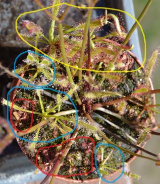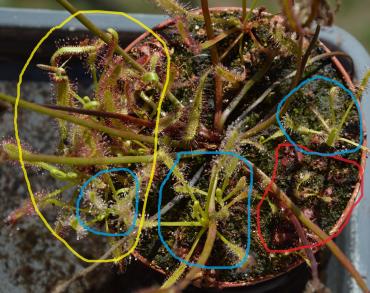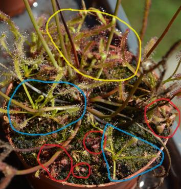 Witam! Od wiosny posiadam binate i razem z nia od poczatku rosna mi w jednej doniczce inne rosiczki. Z racji, ze czas zimowania dla binaty zbliza sie powoli dlugimi krokami, chcialbym z Wasza pomoca zindetyfikowac reszte rosnacych z nia rosiczek, zeby ewentualnie jeszcze przesadzic te, ktore nie wymagaja zimowania. * W niebieskiej obwodce zapewne jest to D. capensis * W zoltej obowdce wydaje mi sie, ze jest to D. x obovata albo D. Anglica * Rosiczki rozetowe w czerwonej obwodce: nie mam pojecia jaki to moze byc gatunek D. binata, z tego co pamietam, to byla kupowana chyba w Carnisanie. Jesli potrzebujecie dokladniejszych zdjec, to wrzuce je wieczorem. PS Chyba to powinno byc w dziale identyfikacja