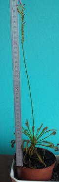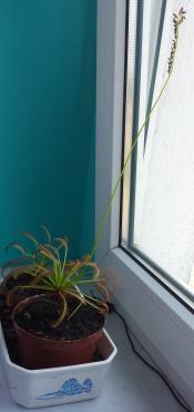 Moja D.Capensis kwitnie już trzeci tydzień co mnie bardzo cieszy i zarazem martwi. Zauważyłem, ze pęd kwiatowy skierowany jest w stronę szyby natomiast cala roślina przeciwnie... tak jakby tworzyła przeciwwagę. Czy dalszy wzrost pędu kwiatowego nie zaszkodzi roślinie ? Jak długo może kwitnąc rosiczka i do jakich długości urasta ped kwiatowy ?