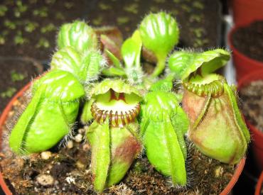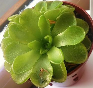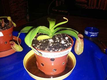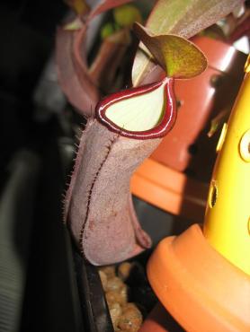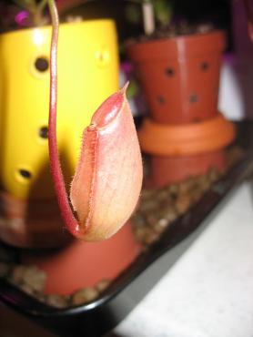 Jest wyczekany dzbanek Dzbaneczniki chętnie się dzielą (ten dzbanecznik był wsadzony do podłoża jako końcówka pędu na początku maja tego roku, rośnie i dzbankuje w ekspresowym tempie i już wypuszcza "młode") Na parapecie obok dzbaneczników królują tłustosze: Pinguicula gigantea Pinguicula reticulata Pinguicula ehlersiae Stoi też jeszcze Cefalotus ale jego dni na tym parapecie są policzone - już niedługo będzie przeniesiony do zimowania