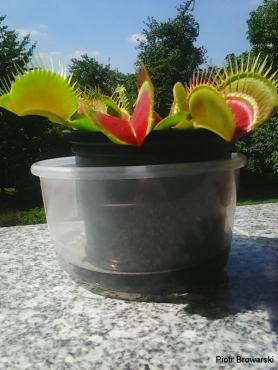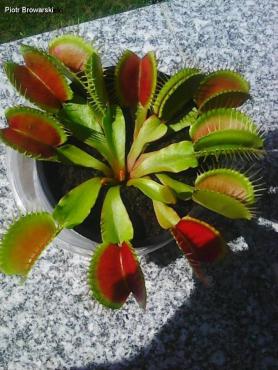 Witam. W tej chwili posiadam dwie rosiczki capensis oraz dwie muchołówki (regular i dutch) Dutch na razie jest zbyt mały, także nie ma się czym chwalić. Może w przyszłym roku będzie wart pokazania (hehe) Posiadałem też dwa regulary muchołówki, ale jeden dałem mojemu siostrzeńcowi, bo bardzo mu się spodobał, a w marketach raczej trudno mu byłoby znaleźć podrośnięty i zadbany egzemplarz. Dlatego został mi tylko jeden regular hodowany od kwietnia (kupiony był jako malutka roślinka w 6cm doniczce w OBI). Jeśli chodzi o rosiczki, to kilka dni temu kupiłem drugiego capensisa, ale na razie nie ma się nim też co chwalić, bo potrzebuje trochę czasu, by się odbić po męczarniach w sklepie. Poniżej prezentuje mojego regulara oraz kępkę capensisów. Jak widać, robi się coraz bardziej gęsto. Muchołówka gdzieś od połowy lipca dostała kopa, i wali nowymi liśćmi bez opamiętania (podejrzewam,że to z powodu dużej liczby owadów, które nałapała w ciągu ostatnich jakiś 7 tygodni). Capensis też jest gęsty. Jedyny minus jest taki, że część zielona liścia jest dłuższa, a krótsza część owadożerna (podejrzewam że to z powodu lekkiego zagęszczenia?)