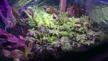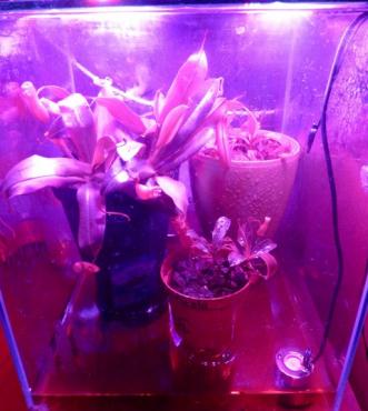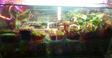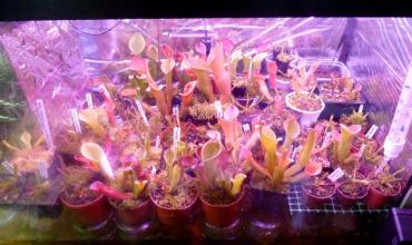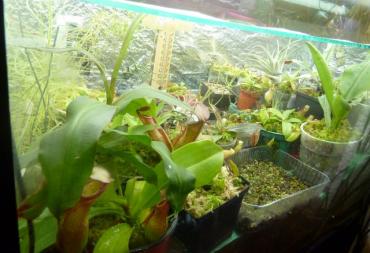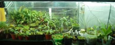 7. Witajcie, w tym temacie pokażę Wam kilka terrariów jakie zbudowałem. Będą to terrarium górskie, pośrednie, trzy nizinne i tłustoszarium. Może komuś się przydadzą te informacje i zapragnie spędzić wiele dni na majsterkowaniu jak ja. Terrarium górskie: Wymiary: 100x40x60 (kupione gotowe szkło) Temperatura: 19-20° C dzień, 12-13° C noc Wilgotność: 80-100% Oświetlenie: 5m taśma led grow 14,5W/m, 5m taśma biała zimna 5W/m (dla neutralizacji różowego efektu), 8x żarówki led grow 6W +uzupełniająco światło słoneczne Zbiornik odizolowany z tyłu i po bokach styropianem. Ściany odbijają światło (użyłem do tego celu srebrnej strony folii termicznej, w tym terra trochę niedbale). Do chłodzenia użyłem wymontowanego układu z lodówki, kompresor i kratka znajdują się za terrarium by nie było widać, a zamrażarnik jest wewnątrz. Wiatrak 1 zamontowany jest tak by wdmuchiwać powietrze do zamrażarnika, które opuszcza go spodem. Dzięki temu nie ma wahań temperatury. Wiatrak 2 ciągle intensywnie miesza powietrze wewnątrz terrarium. Wiatrak 3 włącza się kilka razy na dobę po 10 minut wymieniając powietrze wewnątrz-zewnątrz. Tuż nad górną szybą znajduje się wyżej wspomniany panel, który nie styka się z szybą i jest zamontowany na metalowej dziurkowanej kratce. Dopiero nad panelem znajduje się pokrywa, która jest lekko uchylona jednym końcem. Wiatrak 4 pracuje tylko gdy panel jest włączony i wytwarza ciąg powietrza właśnie tą warstwą gdzie znajduje się panel, a ciepłe powietrze wywiewane jest uchyloną pokrywą. W terrarium zamontowany jest termostat i higrostat w jednym. Utrzymuje temperaturę z dokładnością do 1 stopnia, gdy temperatura wzrasta, włącza układ z lodówki. Higrostat natomiast podłączony jest do foggera, ten intensywnie zamgławia rano i wieczorem, a w ciągu dnia tylko gdy wilgotność spada poniżej 80%. Obieg wody praktycznie zamknięty, rzadko muszę podlewać, raz na tydzień bądź dwa. Na pokładzie heliamfory, darlingtonie. Terrarium pośrednie: Wymiary: 120x60x52 (samodzielnie klejone) Temperatura: 23-24° C dzień, 16-17° C noc Wilgotność: 70-100% Oświetlenie: 4x36W świetlówki 6500k daylight +uzupełniająco światło słoneczne Działanie podobne do pierwszego. Ściany odizolowane, lustrzane. Termoregulator ustawiony z dokładnością do 1° C włącza układ z drugiej lodówki. Fogger włącza się czasowo. Dwa duże wiatraki skutecznie mieszają powietrze w terrarium. Na pokładzie dzbaneczniki, pływacze, cefalotusy, rosiczki. Terrarium nizinne 1: Wymiary: 80x40x50 (kupione gotowe szkło) Temperatura: 27-35° C dzień, 24-26° C noc Wilgotność: 70-100% Oświetlenie: 5m taśma led grow 14,5W/m, 2x świetlówki 18W 6500k +uzupełniająco światło słoneczne Ściany lustrzane, oświetlenie bezpośrednio na górnej szybie. Fogger włącza się czasowo. Jeden wiatrak do mieszania wewnątrz, drugi do wymiany wewnątrz-zewnątrz. Na pokładzie dzbaneczniki, żenlisee, rosiczki. Terrarium nizinne 2: Wymiary:110x45x45 (samodzielnie klejone) Temperatura: 32-35° C dzień, 24-28° C noc Wilgotność: 70-100% Oświetlenie: 2x36W i 2x40W świetlówki 6500k + uzupełniająco światło słoneczne Budowa jak poprzednio. Na pokładzie dzbaneczniki, pływacze, byblisy, rosiczki. Mini terrarium nizinne: Wymiary: 35x35x40 (kupione gotowe szkło) Temperatura: 30-40° C dzień, 25-28° C noc Wilgotność: 80-100% Oświetlenie: 6x6W żarówki led grow +światło słoneczne Raczej rezerwowy zbiornik. Na pokładzie dzbaneczniki. Tłustoszarium: Wymiary: 60x40x30 (samodzielnie klejone) Temperatura: 26-28° C dzień, 24-25° C noc Wilgotność: 40-60% Oświetlenie: 6x żarówki led grow 6W, 1x biała zimna 6W (dla neutralizacji różowego efektu) +szczątkowe światło słoneczne. Ściany lustrzane. Podłoże luźno pokrywa dno zbiornika. Pracuje jeden wiatrak mieszający. Na pokładzie same tłustosze. Wszystko znajduje się na poddaszu. Oświetlenie włącza się we wszystkich przypadkach o 6, a gaśnie o 20. Także w pozostałej części hodowli, która nie przebywa w terrariach. Do tego celu używane są elektroniczne sterowniki czasowe. Na koniec jeszcze jak wymontować układ z lodówki bez rozszczelnienia go. Zacznijmy od tego, że nie każdą lodówkę da się tak rozłożyć. U chyba wszystkich nowszych modeli, wszelkie przewody zatopione są w ściankach i nic nie da się zrobić bez cięcia ścianek bądź przewodów. Jednak starsze modele przewody mają na wierzchu, a cały zamrażarnik jest wyjmowalny. Całość operacji trwa koło 15 minut i nie ma nic bardziej skomplikowanego niż wykręcanie śrubek. Przewody chłodnicze można śmiało giąć, ale nie pod ostrymi kątami. Termostat raczej nam nie potrzebny dlatego można go odciąć i złączyć przewody. Oczywiście wszystko w pozycji pionowej. Jeśli nie złamaliśmy przewodu albo nie odwróciliśmy kompresora do góry nogami to układ jest sprawny i szczelny, więc można działać. Oczywiście nikogo do tego nie namawiam, opcja z piwnicą jest łatwiejsza do wykonania i pewnie tańsza, ale przedstawiam Wam sposób który działa i jestem z tego zadowolony Kilka zdjęć roślin: