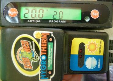 5. Wymontowany układ wygląda tak: Mamy do odkręcenia 4 większe śruby, które trzymają kompresor. Kolejne 4 mniejsze gwiazdkowe od tylnej klapki zamrażarki, wewnątrz również jest 3-4 śrubki i dodatkowe zatrzaski, kratkę trzyma też kilka sztuk. Potem trzeba wysuwać ukłąd do tyłu (przyda się ktoś do pomocy, jeden wysuwa zamrażarke, a drugi kompresor z kratką), może nam w tym przeszkodzić kabel. Jest umiejscowiony w taki sposób, że odcięcie to jedyne rozwiązanie. W środku są 4 przewody, 2 od światła w lodówce i 2 od termostatu. Te od termostatu łączymy po odcięciu, od światła można zabezpieczyć bez łączenia. Teraz układ stawiamy gdzieś za terrarium, by nie rzucał się w oczy. Trzeba zrobić jakąś podkładkę pod kompresor, gdyż ten czasami mocno się nagrzewa. Zamrażarka jest połączona jednym przewodem chłodniczym, który można giąć dowolnie. Wkładamy ją do środka terrarium i modelujemy przewód jak chcemy. Ja wypuściłem przewód górą w wiązce wraz z przewodami od foggera, wiatraków, termostatu/higrostatu (terrarystyczny). Po podłączeniu pod własny termostat warto ustawić tolerancję np. 1 stopień, aby lodówka nie włączała się zbyt często. Stare lodówki po wyłączeniu muszą chwilę odpocząć Ja używam takich termostatów: Układ używa około 100-140W, przy dobrej izolacji nie musi się często włączać. Wady: duża zajęta objętość terrarium, nie każdemu się podoba taki twór w zbiorniku. Zalety: duża kontrola, optymalne sterowanie podczas długich nieobecności w domu.