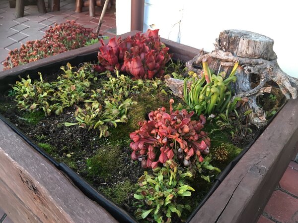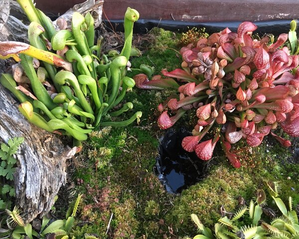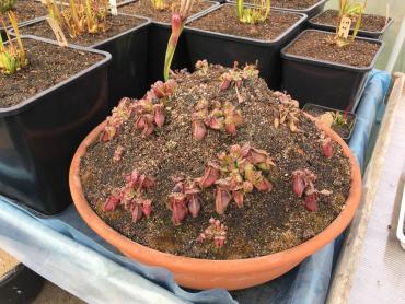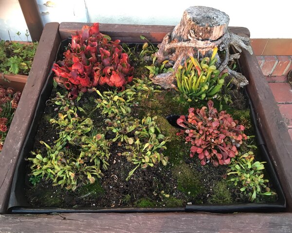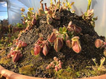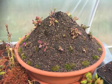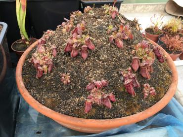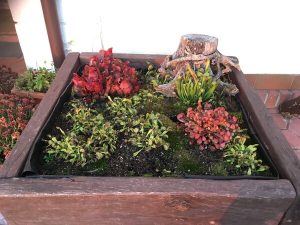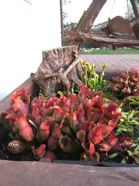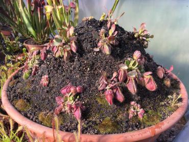 Witam. Chciałbym zaprezentować swoją uprawę cefali na usypanym kopcu. Cephalotusy w naturalnym środowisku rosną na piaszczystych stokach w okolicach morskich plaż, dlatego kopiec ten miał za zadanie zapewnienia jak najbardziej zbliżonych warunków w jakich rosną w naturze. Jest to w pewnym sensie doświadczenie, pokazujące jak rośliny te poradzą sobie w ekstremalnie suchym podłożu. Dno donicy wysypane jest ok 5 cm warstwą żwiru mającego zapewnić drenaż. Następnie wyłożona jest cienka warstwa gliny. Kolejna warstwa to około 10 cm mieszanki kwaśnego torfu, piasku i podłoża Aqua Soil. Ostania warstwa to cały nasyp składający się z gruboziarnistego piasku i torfu w stosunku 2:1. Donica z cefalami stoi w tunelu foliowym gdzie latem panują bardzo wysokie temperatury. Przy takich warunkach mimo tego, że donica ma cały czas dostęp do wody, góra kopca wysycha praktycznie na wiór. Jednak cephalotusą zupełnie to nie przeszkadza :-) Tak wyglądało to zaraz po wykonaniu A tak w następnym roku