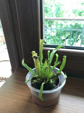 Kupiliśmy kapturnice Sarracenie (chyba Farnhamii) jakieś 4 miesiące temu. Wszystko było w porządku, a od kilku dni zaczęła tak jakby usychać liście. Dostaliśmy informacje na kartce jak ją podlewać i tak dalej. Ma cały czas dostęp do wody, stoi na parapecie więc w miarę dostęp do światła również ma. Niedawno pojawiły się też dwa płaskie dzbanki.