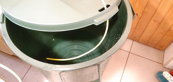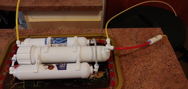 ... czyli jako-tako. Nie pasował mi ten temat do żadnego innego działu, a być może ktoś się waha, czy kupić i założyć filtr RO, być może nie ma gdzie podłączyć - sam miałem takie obawy, ale niesłusznie. Kupiłem filtr z tego linku: https://allegro.pl/oferta/osmoza-ro3-akwa-150-gpd-super-dokladna-3-zatyczki-8090425872 Filtr zamocowałem w kilkanaście minut od wyjęcia z opakowania do węża słuchawki prysznicowej, która wystaje mi w piwnicy ze ściany (nie pytajcie). Sama kotłownia służy obecnie za miejsce do zbiorowego gromadzenia starych mebli po remontach, więc dopóki gabarytów nie odbiorą, to jest tam bardzo ciasno i daleko od idealnych warunków do zakładania instalacji RO. Jak widać, złożony filtr leży sobie na płasko na jednym ze starych mebli - nie trzeba do instalacji nawet podstawowych narzędzi inżynierskich, czyli taśmy klejącej i trytytek. Wystarczy taśma teflonowa (w zestawie) i tacka (gdyby taśma teflonowa postanowiła przeciekać). Wąż od słuchawki prysznicowej (1/2 cala) podpięty do zaworka z wężykiem doprowadzającym wodę do filtra wstępnego, węglowego, a następnie membrany. Konieczny był zakup zaślepki na koniec złączki (choć można tam podłączyć zaworek i słuchawkę, jeżeli ktoś lubi się myć z tysiącem króćców w ręce ). Przez dwa dni wodę gromadziłem do butelek, później postanowiłem kupić zbiornik na większą ilość. Zbiorniki na deszczówkę są ogromne i niepraktyczne w moich zastosowaniach, więc zaopatrzyłem się w pojemnik na śmieci z Leroy Merlin za 60-70 złotych, 90 litrów pojemności. Wężyk z czystą wodą napełnia pojemnik, wężyk z wodą odpadową idzie do kanalizacji (choć zbieram go czasem do wiaderek i podlewam kwiatki w ogródku). Wygląda nieestetycznie, ale działa! Po zakończeniu wszystkich remontów i na mechanizmy RO przyjdzie czas, aby uporządkować. Jeśli ktoś jest zainteresowany parametrami, to spieszę z odpowiedzią! Woda z kranu: sumaryczna zawartość soli na poziomie 130-180 ppm (zależy od tygodnia); pH = 7.70 Woda po filtracji: sumaryczna zawartość soli na poziomie 3 - 7 ppm; pH = 6.70 Woda odpadowa: sumaryczna zawartość soli na poziomie 170-230 ppm; pH = 7.72 Czas otrzymywania 1 litra wody demineralizowanej: 4 minuty 24 sekundy (13,64 litra/h) Stosunek wody oczyszczonej do odpadowej (objętościowo): 1 : 1,88 (1 litr wody czystej na 1,88 wody odpadowej) Polecam wszystkim! Koszty kupna wody demineralizowanej zwracają się w perspektywie ok. pół roku (przynajmniej wg moich szacunków). Przy okazji będzie stosowana do żelazka. PS. Wszędobylskie spodki i podstawki to tylko dlatego, że początkowo nigdy nie ufam swoim połączeniom i sztuce technicznej