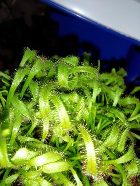 W tym poście chciałbym opisać moje wrażenia po używaniu przez 1,5 miesiąca "żarówki" LED z tej oto aukcji: http://allegro.pl/zarowka-led-grow-28-w-do...19.html#thumb/1 (nie reklamuję, po prostu informuję). Lampka jest prosta w użyciu (gwint E27), więc może być celem niektórych hodowców, którzy zastanawiają się, czy takiego typu rozwiązanie do czegoś się może nadać, dlatego postanowiłem coś o niej napisać. Opis samej lampki sobie daruję, gdyż informacje te są dostępne pod w/w linkiem. Z tego co widzę, to nie ma podanych długości fal, ale kiedy kupowałem, to były podane czerwone i niebieskie odpowiednio 660 nm i 450 nm. Rośliną testową była rosiczka przylądkowa w ilości kilku odrostów w jednej doniczce. Była ona raczej w stanie średnim, gdyż nie była wybarwiona i była pozbawiona kropelek praktycznie na wszystkich liściach. Rosłą powoli, a z daleka wyglądała trochę jak sałata Po prostu była. Drosera była oświetlana dzień w dzień w ilości światła ok. 10-12h/dobę w odległości kilku centymetrów od liści. Jak zauważyłem, takie różnice w czasie oświetlania nie robiły na roślinie żadnego negatywnego wrażenia. Dodam, że owa żarówka byłą jedynym źródłem światła. Moje wrażenia? Zdaję sobie sobie sprawę, że rosiczka przylądkowa to czołg wśród rosiczek i bardzo wiele jej nie potrzeba, ale lampka przez 1,5 miesiąca bardzo dobrze się sprawdziła. Roślina rośnie szybciej, liście są dużo dłuższe ogólnie jak i w częściach owadożernych, a włoski gruczołowe ładnie się wybarwiły i pokryły kropelkami. Ogólnie jest dobrze. Jednak, żeby nie było tak kolorowo, to dość niska moc żarówki (28 watów) i gabaryty sprawia, że lampka nadaje się do całkowitego oświetlania najwyżej jednej dorosłej rośliny, ewentualnie kilku sadzonek. Opisane wyżej efekty występują głównie w górnej części rośliny, które były najbliżej diod, a liście przy podłożu pozostawały "nijakie" lub zmieniały się na plus bardzo nieznacznie. Podsumowując, efekty są i to wyraźnie zauważalne. Na jedną roślinkę spokojnie wystarczy, choć różowawe światło może niektórych denerwować. Ale czy takie same efekty uzyskałoby się zwykłą, białą świetlówką? Tego osobiście nie wiem. Dodaję też kilka zdjęć ukazujących zmiany zachodzące w roślinie 14 grudnia 7 stycznia 28 stycznia (czerwoną linią zaznaczyłem stan początkowy)