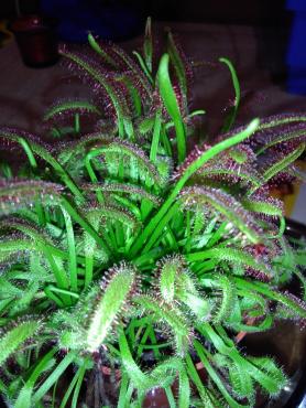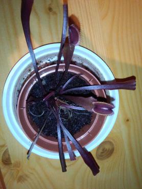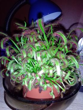Z moją muchołówką, którą aktualnie doświetlam było tak: Kupiona we wrześniu. Piękna, wybarwiona z dużymi pułapkami i w ogóle ah i oh. I tak sobie żyła na północnym parapecie aż do około początku stycznia. Po drodze zaczęła wszystkie wymienione cechy zatracać, oczywiście z braku odpowiedniej ilości światła, ale to za nim przyjąłem ją na kurację. W okolicy świąt jeszcze zakwitła, a potem w ogóle przestała rosnąć. Wtedy dopiero wziąłem ją do siebie. Do piwnicy i na jakieś 3 tygodnie sobie zasnęła. Po tym czasie zauważyłem, że zmizerniała jeszcze bardziej, więc postanowiłem wziąć ją pod panel LED i naświetlić. Tak wyglądała w pierwszym dniu naświetlania: Jak widać na załączonym obrazku, po prostu sałata. Ale to zrozumiałe po warunkach, w jakich była trzymana. Po 19 dniach wygląda : Dwie pułapki-niedobitki błyskawicznie sczerniały pod wpływem światła, obciąłem je i zostały same ogonki liściowe. Na ich miejsce szybko wyrosły dwie nowe łapki i kolejne idą w ich ślady. Nie obcinałem "pustych" ogonków, ponieważ, mimo braku estetyki, zapewniają one główną powierzchnię asymilacyjną, co jest najważniejsze dla niegdyś tak osłabionej muchołówki. Jak widać, efekty są, a muchołówka odzyskuje wigor. Jeszcze trochę i będzie wyglądać jak w dniu zakupu. Tym wpisem chcę cię przekonać, żebyś zapewnił swojej muchołówce odpowiednie oświetlenie już teraz, bez dodatkowego zimowania.