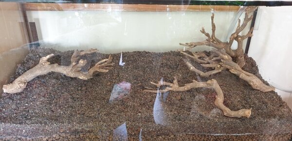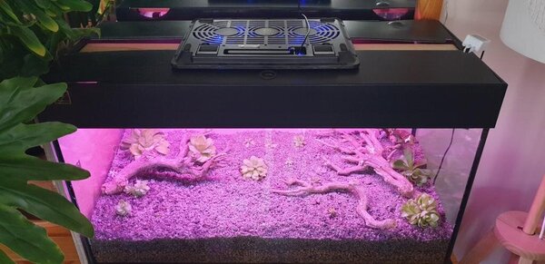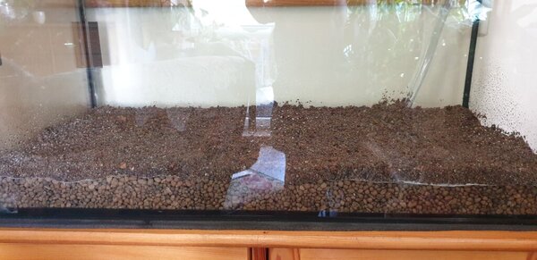 Podłoże zostało wymieszane z następujących składników: wermikulit (lawa wulkaniczna, frakcja 3-6), żwirek (frakcja 2-4), piasek do akwarium (bardzo drobny, frakcja nawet nie 1), torf sphagnum i torf z perlitem (miałem to wykorzystałem, szkoda było wywalić. Proporcje składników zastały chyba zachowane czyli żwirek : piasek : wermikulit : torf 3:1:3:3. Kilka kawałków korzeni otrzymałem od mojej Kasiuni i umieściłem jakoś w środku, przesadziłem roślinki z doniczek, które zajmowały wcześniej. Zalałem warstwę keramzytu poprzez system nawadniania, ale fajnie to zabrzmiało, przykryłem wszystko zostawiając delikatną szparkę na powiew wentylatora, gdyby ktoś szukał czegoś do sztucznego wiatru w akwariach polecam podkładki pod laptopy, wiatraczki ciche, mały pobór i co najważniejsze tanie.