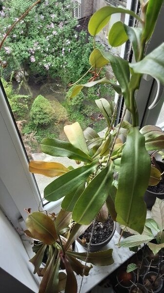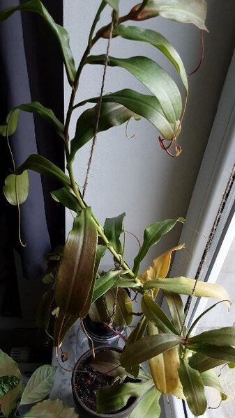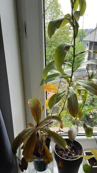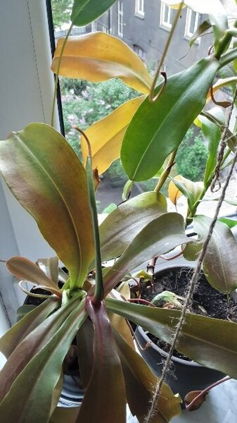 8. Cześć, Obawiam się, że robię coś źle przy moim dzbaneczniku, ale mam problem z ustaleniem przyczyny. Dzbanecznik został zakupiony w marcu 2019 i nigdy nie było z nim problemu. Raz tylko za bardzo go przesuszyłem i zgubił wszystkie dzbanki, ale po tym czasie bardzo mocno wystrzelił (nie był podlewany odżywkami itp.). Obecnie ma dwie długie łodygi, a z ziemi wyrasta nowa, która ma bardzo dużo liści i kilka dzbanków. Zauważyłem, że ostatnio masowo zaczynają mu żółknąć liście, ale jednocześnie wyrastają mu nowe liście na starych łodygach. Kolor na pozostałych liściach też trochę mnie niepokoi. Za sucho? Za mokro? Jest podlewany raz dziennie 50ml przegotowanej i odstanej wody. Ekspozycja wschodnia. A może powinien go przesadzić / rozsadzić? Proszę o wskazówki, zdjęcia poniżej. Filip