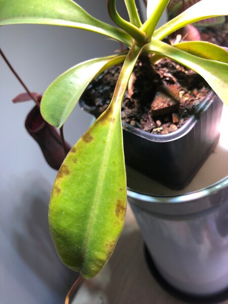na jednym z liści mojego dzbanka pojawiły się takie plamy, czyżby był to grzyb? Jaką terapię zastosować? Sam topsin wystarczy?