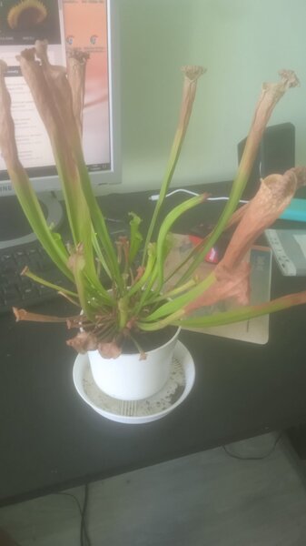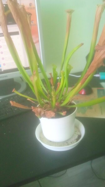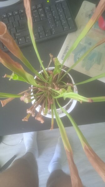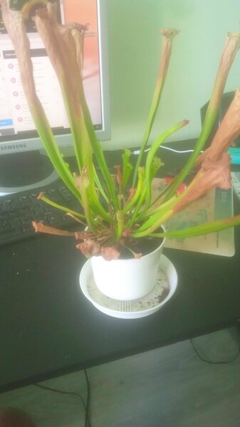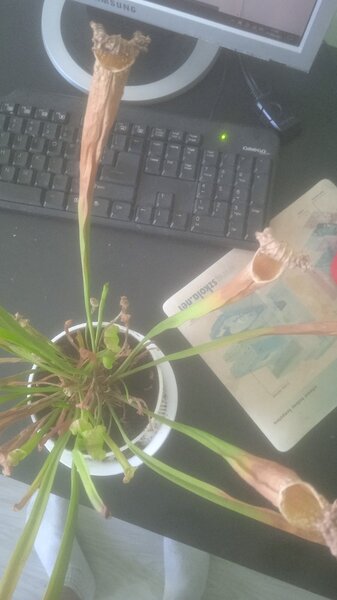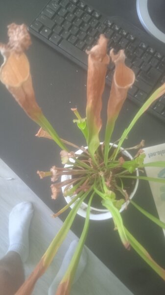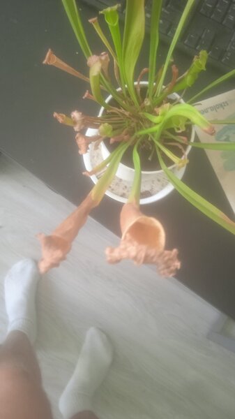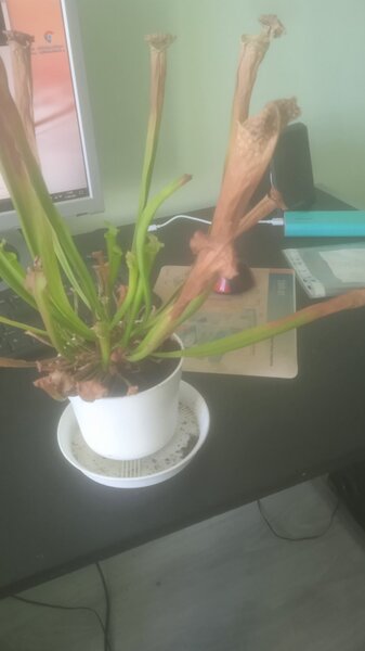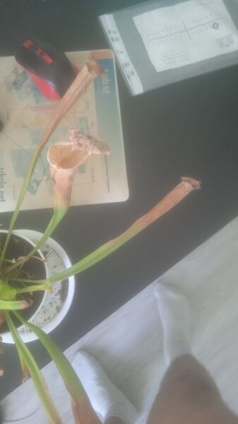 Jutro zrobię zdjęcia, bo już jest ciemno i tym bardziej nie będzie widać nic. Roślina nie jest z marketu kupiłem ją w firmie specjalizującą się w uprawie takich roślin. Roślina była w dobrym stanie duże zielone kaptury jak kaptury usychały to ze starości, tylko po przyjeździe po podeschłą woda w podstawce nie wystarczyła choć nie wiem co się stało nie było mnie. Nie wiem pierwszy raz hoduję i nie wiem jakie warunki powinna mieć aby zimować choć teraz wypuszcza pęd kwiatowy nie sądze aby trzeba był ją teraz zimować. Ale z których kapturów oczyścić tych całkowicie uschniętych czy też cześciowo?