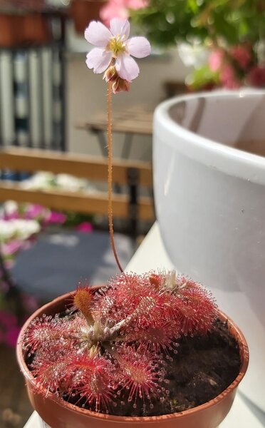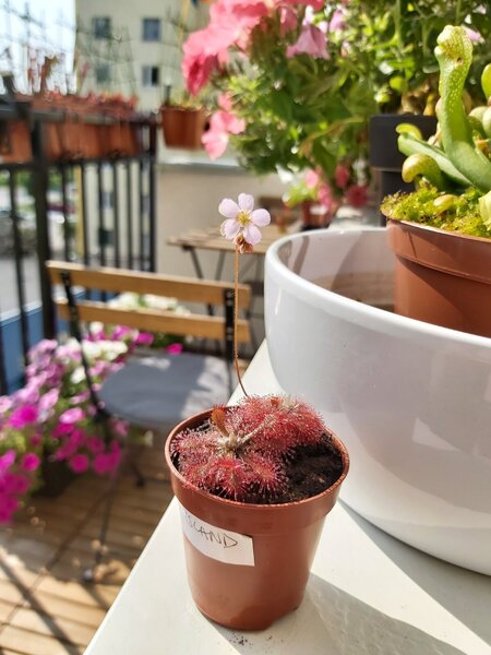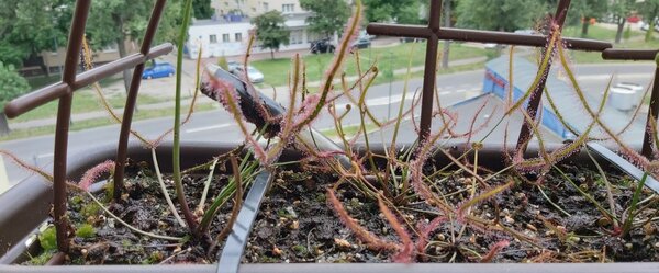 Cepensisy w tak mokrym podłoży radzą sobie fantastycznie. Co mnie trochę dziwi. Jednego wydłubał mi ptak jak podkradał torfowca. Znalazłem wysuszonego na wiór, ale włożony do mokrego torfu odbił (na dole z lewej). Widać różnicę w wielkości do pozostałych. Zalewam skrzynkę dosyć często dodatkową wodą, tak żeby tam było błotko prawie. Rotundifolia kwitła i znów będzie. I najnowsza skrzynka. Rośliny się adoptują. Puszczają nowe kaptury. I jeszcze psittacina która się zapodziała z pierwszej skrzynki Odbijające po ataku ptaków muchołówki.