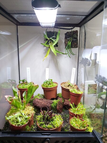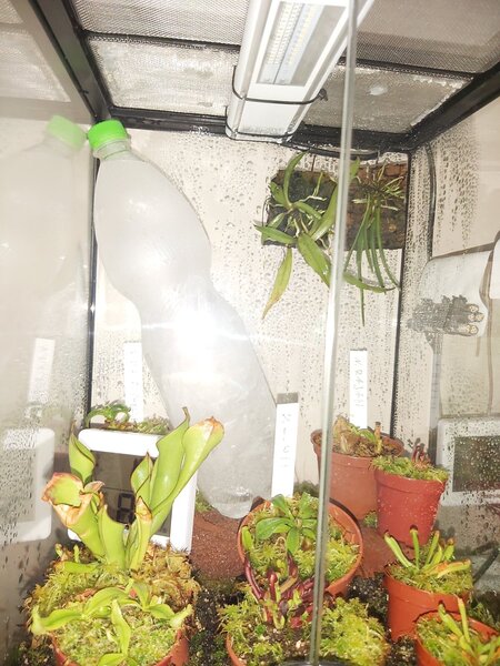 Po zgaszeniu lamp wędruje butelka z zamrożoną wodą (jak najbliżej n.macrophylla). Rano jak wstane, zwykle przed 6, ale i bywa póżniej, butelka wędruje znów do zamrażalki. Woda musi się mrozić dlużej niż 24h, więc mam dwie butelki. Nie bardzo rozumiem o co chodzi z komorą na rosiczki i muchołówki