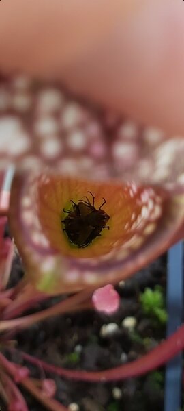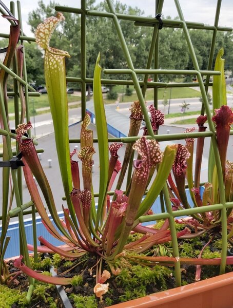 Mała aktualizacja. Rośliny z pierwszej skrzynki szaleją. Miejsca mają już mało i jak patrze na stożki wzrostu to spokojnie można by dzielić. Purpuree najbardziej ucierpiały na wizytach ptaków. Potem nowe kaptury porwały deszcze niestety. Dracula lepiej sobie radzi. Alata jest tak skuteczna, że zaczyna zasuszać swój największy kaptur. Jest pełen much. Równie dobrze jak nie lepiej radzą sobie marketowe hybrydy. Jak je kupowałem to miały kilka małych, głównie całych zielonych kapturów. Teraz rosną 30cm i są pełne much A w środku tego wszystkiego mała darlingtonia Skrzynka z rosiczkami, głównie binaty. Wygląda coraz ładniej. Rośliny są coraz bardziej odporna na warunki atmosferyczne. Binaty ładnie kwitną.