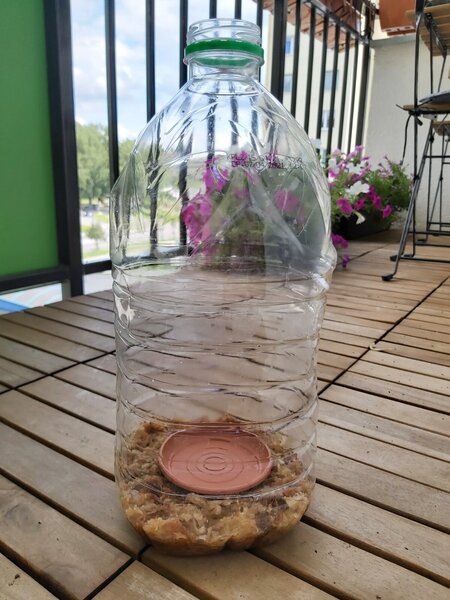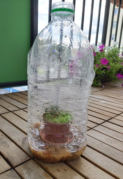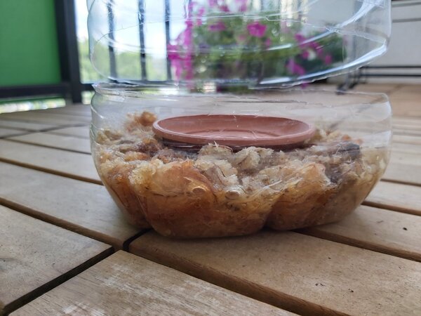 No i musimy się rozstać z moim skarbem na tydzień. Nie będzie już cowieczornego noszenia butelki z zamrożoną wodą żeby był nocny spadek temperatury o jakies 10-12stC. Trzeba oddać mojego nepenthes macrophylle w opieke matki natury. A że akurat ta mama kocha tylko najtwardsze dzieci, a te słabsze szybko chowa to maluch dostał wyprawkę Nadal niestety widać ślady jak odchorował zbyt małe spadki temperatury bez tej butelki. Odżył i ma nawet nowy liść. Stare są piękne, a dzbanki idą. Do meritum. Butelka po 5l bańce destylki z auchan. Podcięta z trzech stron jak widać. Na spód martwy torfowiec, woda i podstawka żeby mi dzbanek w wodzie nie stał. Zroszone po włożeniu. Góra odkręcona, bo jak mi słusznie podpowiedziano ugotuje biedaka (tak, konsultowałem z mądrzejszym ode mnie ). Temperatura różnie jak to na zewnątrz. Przez dwa dni zaobserwowałem w dzień od 24 do 28stC. W nocy raz sprawdzałem i było 20stC o 3:30, gdy w dzień 28 i chwilami ciut więcej. Dobowa amplituda 8stC powinna być. W terrarium ma lepiej, ale przez tydzień ma być dobrze, a nie idealnie. Wilgotność w tym nowym lokum od 70 do 100%. Zwykle 80-85. Stoi grzecznie pod stolikiem, więc nie powinno mu słonko dać w kość.