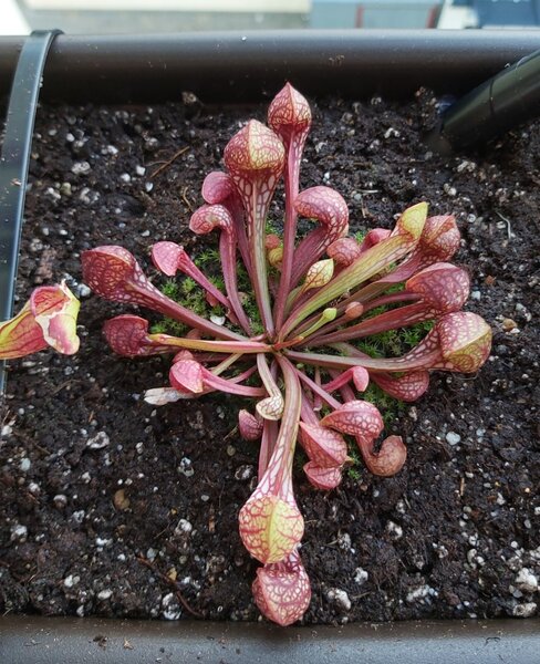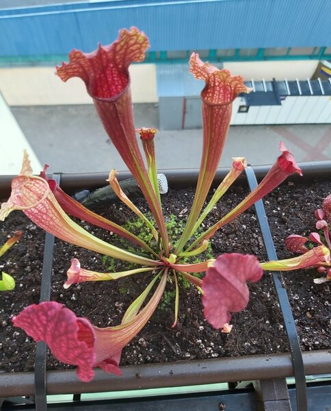 Jest i czwarta skrzynka na balkonie nie mam już raczej miejsca na nowe, więc pewnie ostatnia. Budowa jak wcześniej, więc nie wchodzę w szczegóły. Podłoże to torf z dodatkiem perlitu i żwirku. Górna warstwa (koło 5-7cm) dodatkowo wymieszana z żywym torfowcem. W pierwszej skrzynce tak zrobiłem i fajnie poprzerastał. Razem wszystko będzie co zabezpieczać i zimować Od lewej: MK H47 Sarracenia x formosa, green, anthocyanin free (psittacina green x minor green) (AM) 2002 lub po prostu zielona psittacina Jakaś hybryda z kauflandu. Miałem trzy i myślałem, że są takie same. Nie są Psittacina. Mniejsza niż w pierwszej skrzynce Scarlett belle