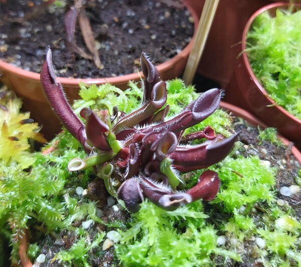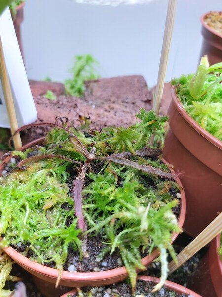 Paradoxy po rozsadzeniu pięknie odżyły. Każda kwitnie. Nawet te małe z dziwnie wyglądającymi końcówkami liści. Kwitnać daje tylko jednej i ma aż trzy kwiatostany. W pozostałych obcinam. Porównując inne rosiczki i paradoxe to mam wrażenie, że kwiat obciąża ją w bardzo małym stopniu (nawet trzy). Jak kwitła neocaledonica to wyglądała jak chora. Po kwitnieniu znów śliczna. Madagascariensis ma już dwa małe odrosty. Zakończyła kwitnąć, a nasionka posiane. Rzut oka na scorpioides Z terrarium zabrałem też trochę torfowca. Bardzo ładnie tam roślnie. Heterodoxa puszcza kolejne duże kaptury. Jest też nowa mała roślina, która odrasta od dużej. Te podsuszone części to niestety moja wina (na początku miała za małą wilgotność). Wszystkie nowe duże wyrośły już u mnie