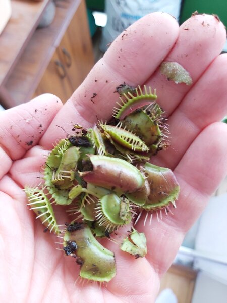 Patrząc na to ile "jedzą" moje balkonowe muchołówki zabrałem się za robote i wczoraj zrobiłem pierwszą papkę dla domowych. Dokładnych proporcji nie napiszę, ale konsystencja (pokarm dla bojowników + deatylka) była prawie pasztetu. Całość rozgniatana moździerzem. Jak rano patrzyłem to 90-95% muchołówek dalej zamknięte i ściśniete, więc nie odrzuciły papki mimo braku ruchu w pułapce. Najgorzej jest z cup trap i kinchyaku, chyba przez kształt pułapki. Gdzieś z tyłu główy jest pomysł na nawożeniu dolistnym dla tych "niejadków" czy najmniejszych, ale musze się jeszcze dokształcić. No i wewnętrznie jakoś nie czuje tego. Muszą "zjeść" 1-2 w roku, więc nie ma jakiegoś ciśnienia, że padną. No i dostały też rosiczki tylko te łatwiej karmić kuleczkami (w takiej formie jest pokarm dla bojowników) niż papką. Papki nakłada się więcej niż kuleczek, czyli pewnie złapie pleśń za jakiś czas. Temat do monitorowania i tyle.