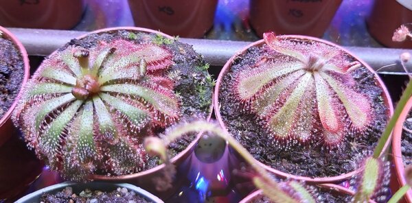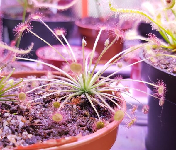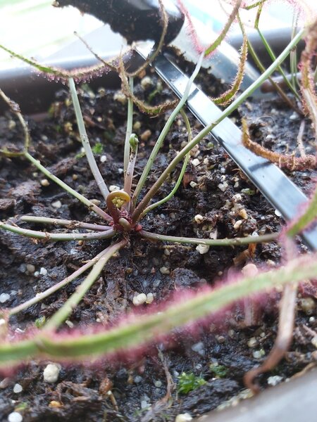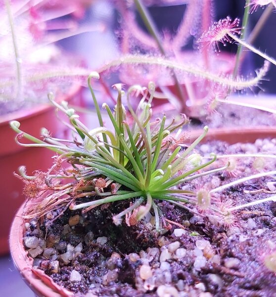 Przeczytałem na forum już tonę materiału i z tyłu głowy gdzieś mi świta, że @MarcinS kiedyś pisał o czerniejących nierozwiniętych końcówkach na d.alicea. Za cholerę nie pamiętam tylko w jakim wątku i tak na 100% nie jestem pewien czy to on. Tak na 95% już tak Problem polega na tym, że rosiczka marnieje. Kolejne liście są mniejsze, mniej kropelkuje lub wcale. Nowe liście zanim się rozwiną mają czarne końcówki. Jakiś tydzień temu ją przesadziłem, a głównie chodziło o sprawdzenie korzeni. Były strasznie długie (doniczka 20cm żeby cały pionowo wszedł) i zdrowe. Przy przesadzaniu bez problemu czerniejące części się zmyły. Dla porównania alicea z tej samej rozsady i trzymana w tych samych warunkach. Rośnie świetnie. Ma ktoś jakiś pomysł?