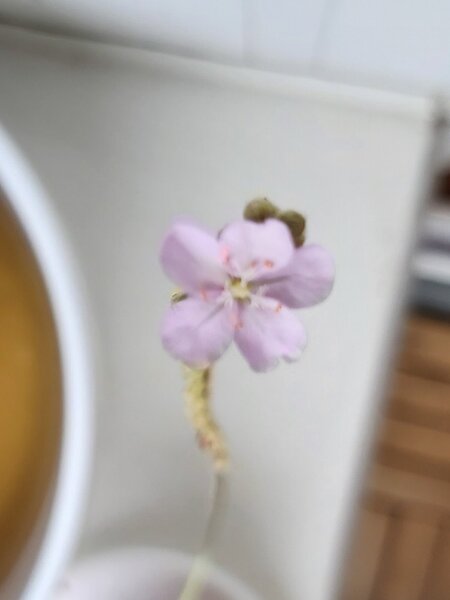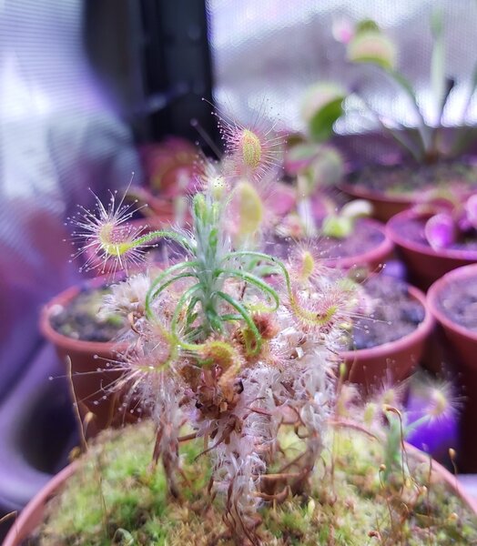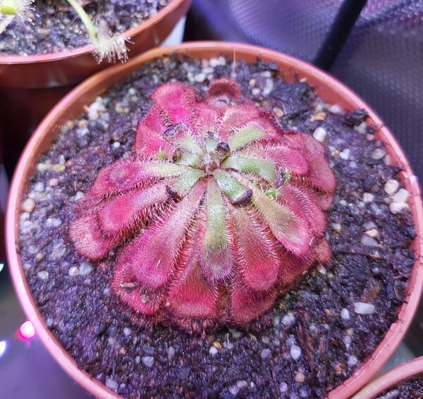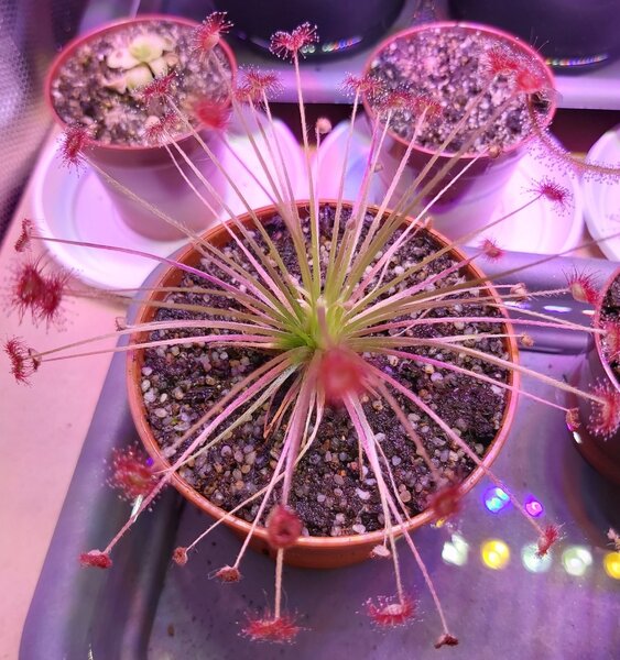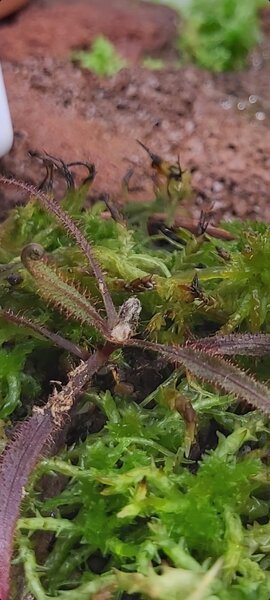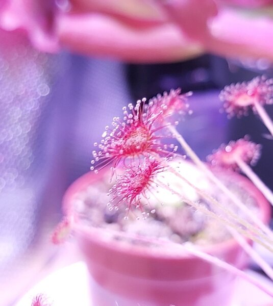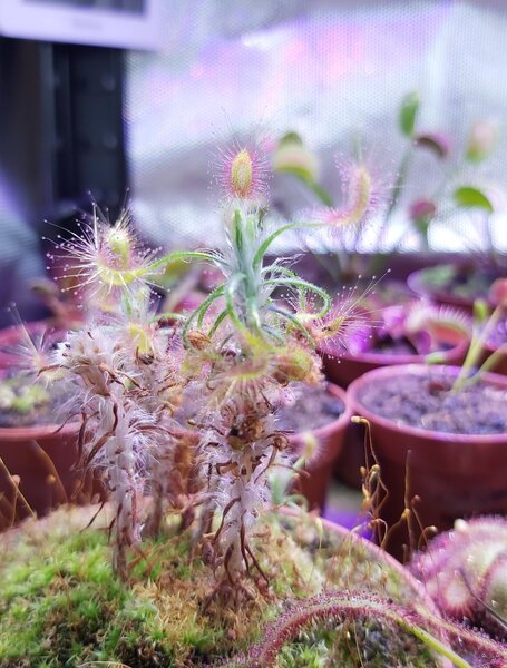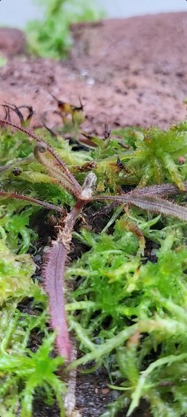 Przekopałem forum, a nawet trochę googla i nie znalazłem nic podobnego. Nie wiem czy to kwestia kontrastu białych włosków z czerwienią po wybarwieniu czy ja po prostu wcześniej tego nie zauważłyem czy najgorsza z wersji, czyli pleśń. Całość stoi w terrarium. Wilgotność 85 do 100%. Temp w dzień 25-27stC, w nocy koło 10stC mniej. Może przy samej rosiczce trochę mniejszy spadek, bo źródłem jest butelka z zamrożoną wodą dla n.macrophylla i butelka stoi bliżej niego. Ewidentnie rosiczka była wystawiona na zbyt mocne światło. Zrobiłem baldachim (kawałek tetry na patyczkach bambusowych), który chroni przed mocnym światłem i znów przyśpiesza ze wzrostem. Nowy rozwijający się liść jest też zielony, a nie bordowy. To może być pleśń? Będę obserwował, ale wole nie czekać aż mocno się rozwinie z działaniem.