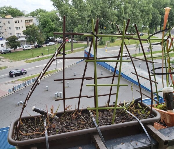 Może nie kopuła z mad maxa, ale konstrukcja stanęła. Oby nie zostało potraktowane przez ptaki jak miejsce do siedzenia. Liczę, że jeżeli to rzeczywiście większe ptaki (np kawki) to zrezygnują, bo utrudni im to "imprezę". Kosów na szczeście nadal u siebie nie widziałem, sikorek też. Dla nich wątpie żeby to był jakiś problem. Trochę się pocieszam, bo rozmiary kup jakie widywałem wskazują raczej na większe ptaki niż kosy. Wiatraczek póki co zostaje. Na upartego mam też stelaż na wypadek gradu, żeby całość przykryć. Z miłych balkonowych rzeczy alata wypuściła 46cm kaptur który pewnie jeszcze się trochę wyciągnie