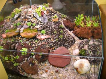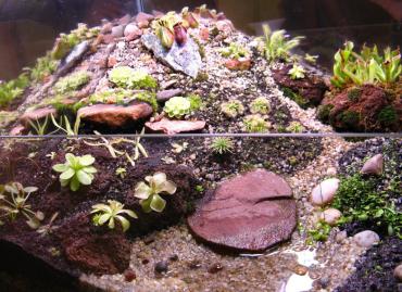 voorhees nie mam niestety zdjęć z kolejnych etapów powstawania terra i układania poszczególnych warstw, ale tak to wyglądało przed posadzeniem roślin. Korzenie, mimo impregnacji, się nie sprawdziły i ostatecznie ograniczyłam się tylko do bryłek lawy i kamieni. Założenie było takie, by stworzyć obszary o różnym poziomie wilgotności podłoża żeby móc wprowadzić dość znaczne zróżnicowanie gatunkowe. Pierwszą warstwę podłoża stanowi kilka cm keramzytu. Na tym powinna znajdować się chłonna tkanina, o której w ferworze walki zapomniałam. Podłoże w terra stanowi torf (w moim przypadku Athena) wymieszany w różnych proporcjach z drobnym i grubszym żwirkiem oraz/lub perlitem (zależnie od tego jakie rośliny planowałam posadzić), a w miejscu planowanego "oczka" jest żwirek kwarcowy. Tłustosze z dolnych partii rosną na bryłkach lawy, a w części przeznaczonej pierwotnie na helki (obecnie U. longifolia) jest torfowiec. Dopełnieniem całości jest folia lustrzana na bokach terra pozwalająca skutecznej wykorzystać niewielkie w sumie oświetlenie. No i jeszcze najważniejszy składnik - czas.
