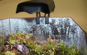 voorhees podlewanie jest niezmiernie łatwe. Wolnym strumieniem leję wodę w najwyższy punkt, czyli róg za dużym cefalkiem. Woda wsiąka w podłoże i nawadnia niższe partie, ostatecznie zbierając się w oczku wodnym, które pozwala mi kontrolować poziom wody. Doświetlanie to po prostu Aquael DecoLight Duo Plant 2 x 11W. Wybrałam ją ze względu na, moim zdaniem, dobre parametry świetlne. Planowałam zastosować dwie takie lampy, ale okazało się, że jedna wystarcza. Wygląda to tak: